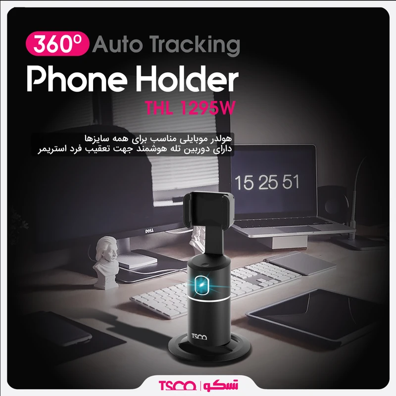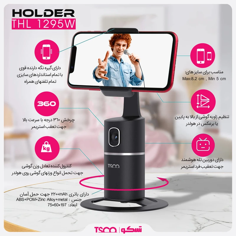 سایر توضیحات : view angle: ۱۰۵ degree / Clip rotation / X:۳۶۰ degree/ ۱۴۵ degree charging port: type C / suitable for mobile size / Max:۸.۲ cm / Min ۵ cm Auto Tracking Mobile Holder / Smart Sensor: Low Latency and Smooth Tracking / Dual core AI Computing Power / No App and Bluetooth Required, ۳۶۰ Rotation / ۸H Battery Life / Best Sensing Distance ۱~۵m / /Type-C Charging Port / Prepared for tripod mount