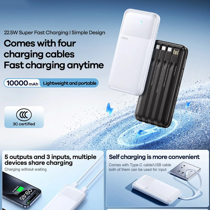 مشخصات فنی : ورودی های این پاوربانک شامل پورت تایپ سی ، کابل تایپ سی و کابل یو اس بی. خروجی های این پاوربانک شامل دو پورت یو اس بی ، کابل تایپ سی، کابل لایتنینگ و کابل میکرو