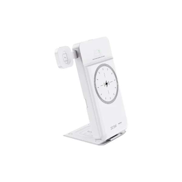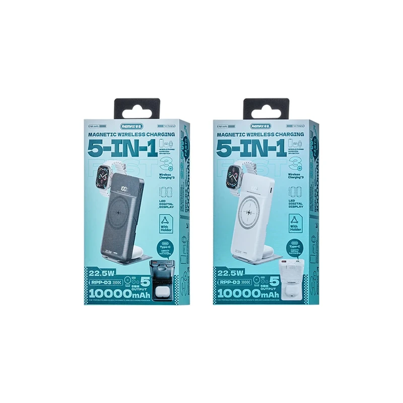 مشخصات فنی : طراحی سبک و قابل حمل مناسب برای استفاده در سفر و روزمره-شارژ سریع پشتیبانی از توان ۲۲.۵ وات-پورتهای خروجی: USB و Type-C-قابلیت شارژ بیسیم مناسب برای گوشیها و ساعتهای هوشمند و ایرپاد-پایه نگهدارنده گوشی امکان تماشای ویدیو یا استفاده از گوشی هنگام شارژ ورودی : دارای دو پورت ورودی از نوع Type-C با ماکزیمم توان ۱۸ وات Input (Type-C): ۵V=۲.۸A/۵V=۲A/۹V=۲A/۱۲V=۱.۵A (۱۸W MAX) خروجی : یک پورت خروجی Type- C با ماکزیمم توان ۲۲.۵ وات Output (Type-C): ۵V=۳A/۹=۲.۲۲A/۱۲V=۱.۶۷A/۱۰V=۲.۲۵A (۲۲.۵W MAX) یک پورت خروجی USB-A با ماکزیمم توان ۲۲.۵ وات Output (USB-A): ۵V=۳A/۹=۲.۲۲A/۱۲V=۱.۵A/۱۰V=۲.۲۵A (۲۲.۵W MAX) سه پورت خروجی بی سیم مخصوص موبایل ، ساعت هوشمند و ایرپاد Wireless Charging Output (for Mobile Phones): ۵W/۷.۵W/۱۰W/۱۵W Wireless Charging Output (for TWS Earbuds): ۵W Wireless Charging Output (for Watch): ۲W امکان شارژ همزمان ۵ دستگاه-پشتیبانی از انواع دستگاهها (گوشیهای هوشمند، ساعتهای هوشمند، هدفون و …)-نمایشگر دیجیتالی برای نمایش میزان شارژ باقیمانده