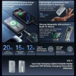 سازگار با : قابلیت شارژ بیسیم و اتصال از طریق درگاه تایپ C و آیفون ، تضمین میکند که این پاوربانک با اکثر دستگاههای دیجیتال امروزی همخوانی کامل دارد.
