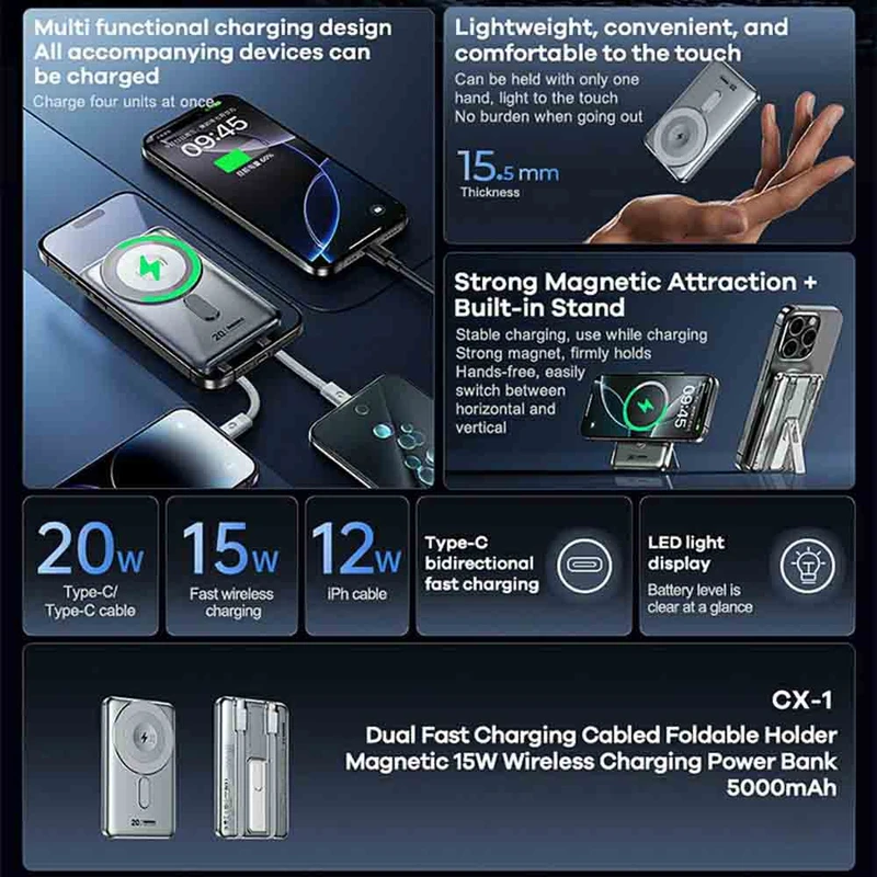 مشخصات فنی : Output Type Type-C*۱/iPh cable*۱/Type-C cable*۱/wireless*۱ Input Type Type-C*۱ Output Voltage Type-C/Type-C cable:۵V-۳A/۹V-۲.۲۲A/۱۲V-۱.۶۷A ۲۰W(Max) iPh cable:۵V-۲.۴A(Max) wireless output:۵W/ ۷.۵W/۱۰W/۱۵W Input Voltage Type-C: ۵V-۳A/۹V-۲A ۱۲V-۱.۵A ۱۸W(Max)