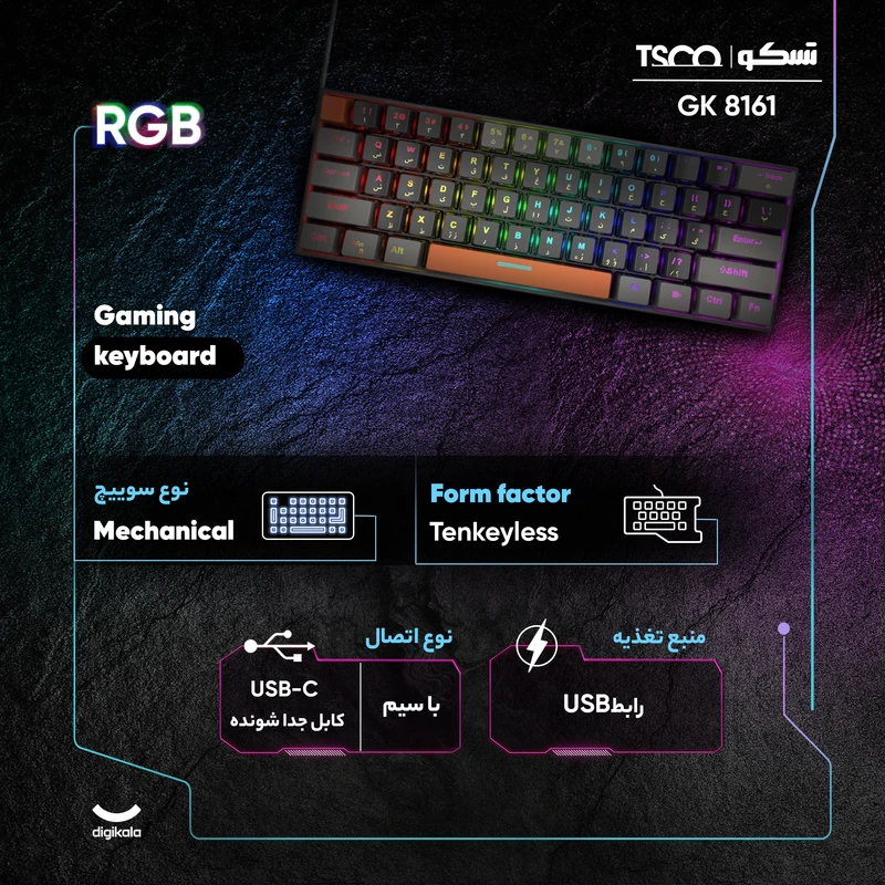 توضیحات چراغ پس زمینه صفحه کلید : ARGB / قابلیت تنظیم و مدیریت نور پردازی از طریق نرم افزار مخصوص تسکوگیم